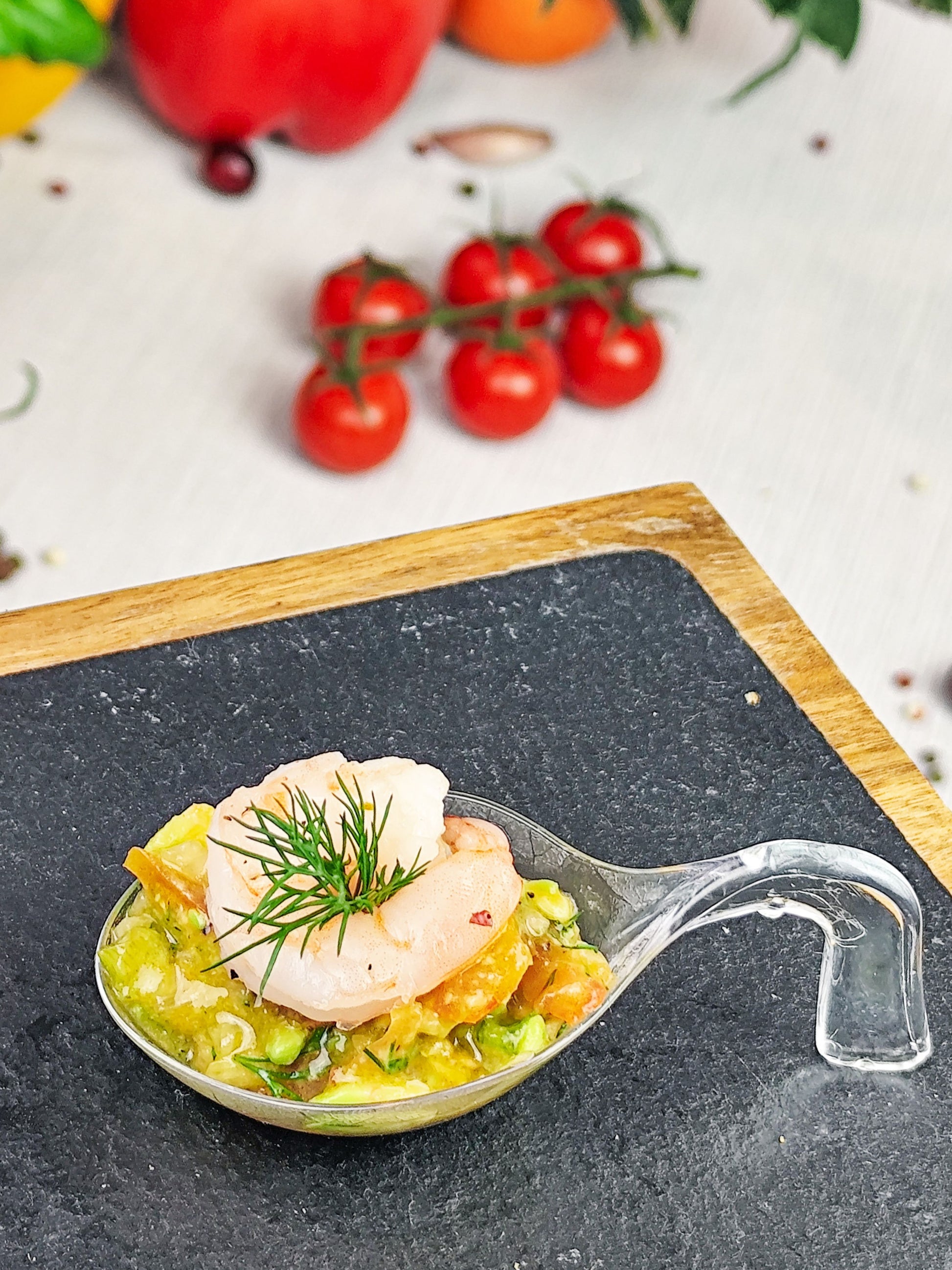 Krevetė, avokadas, pomidoras, svogūnas, krapai, svogūnų laiškai, ypač tyras alyvuogių aliejus, česnakai