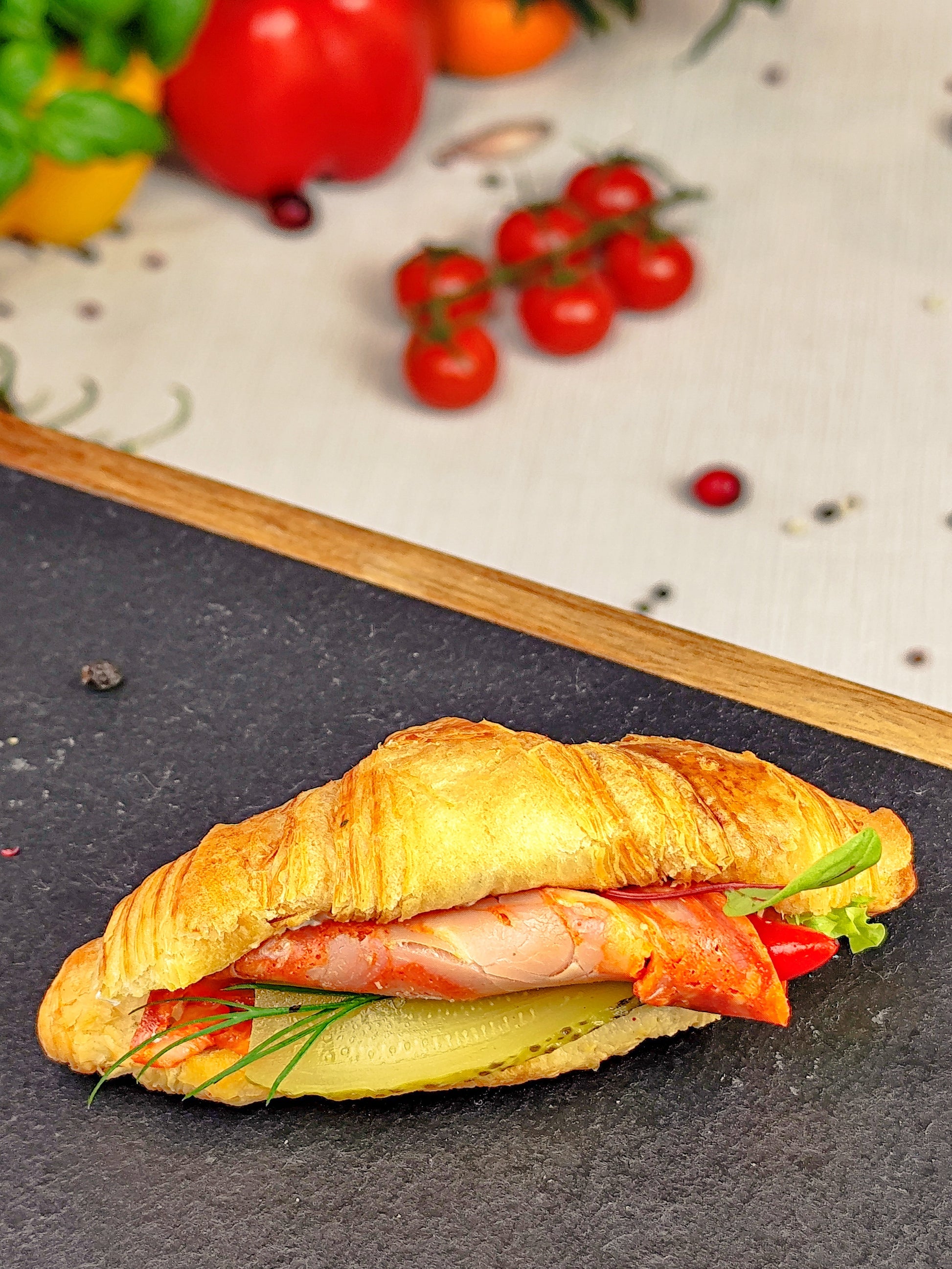 Sviestinis kruasanas, sūrio kremas, salotos, chorizo dešra, marinuotas agurkėlis, mini paprika, svogūnas arba svogūnėlis