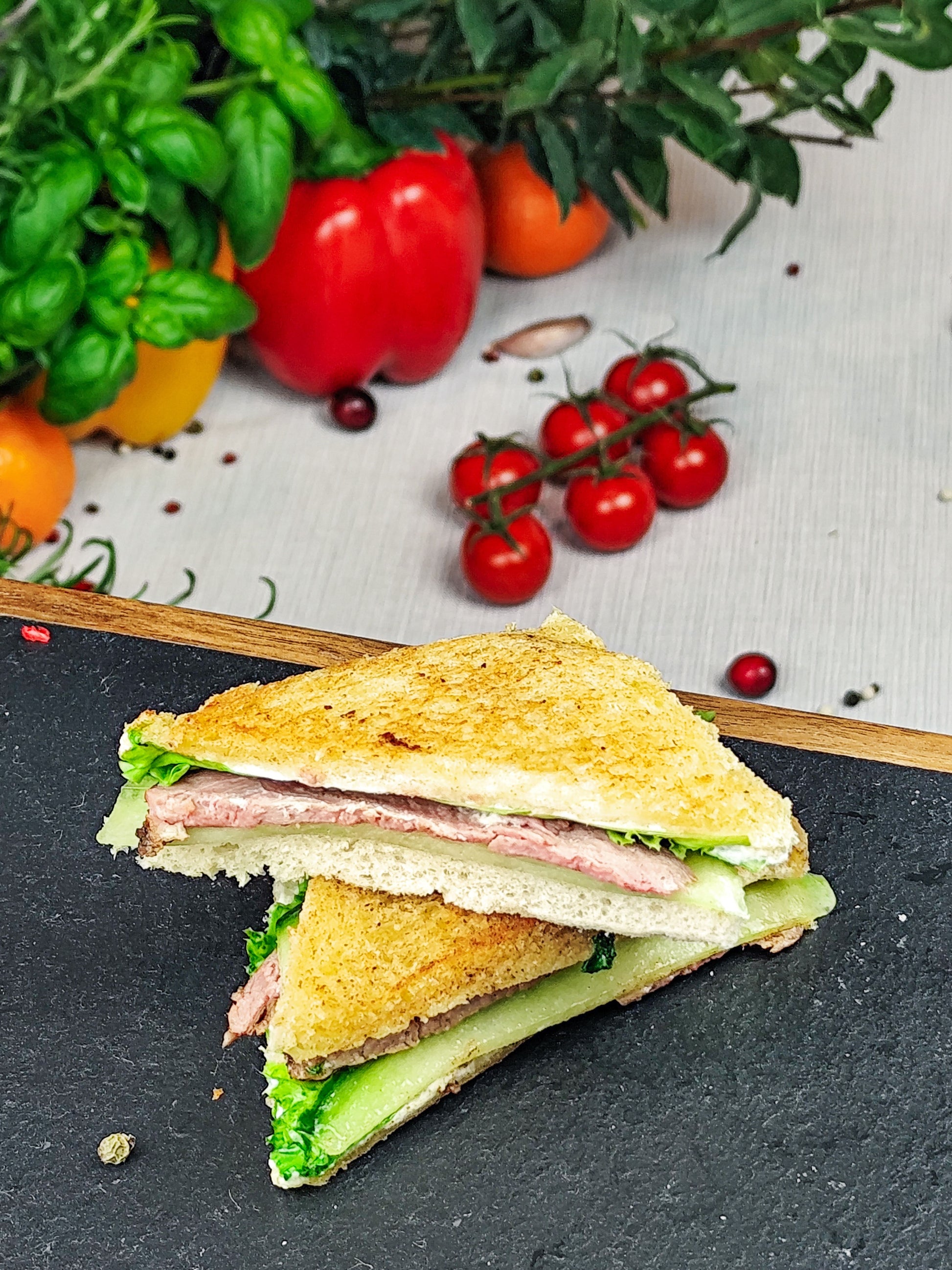 Sumuštinių duona, sūrio kremas, salotos, agurkas, čederio sūris, kumpis